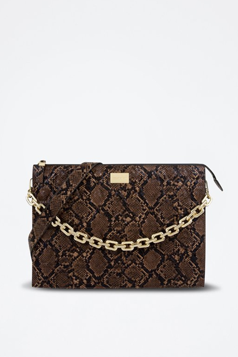 A pochete apresenta um design bicolor simples e elegante com um padrão decorativo acolchoado inspirado na serpente.