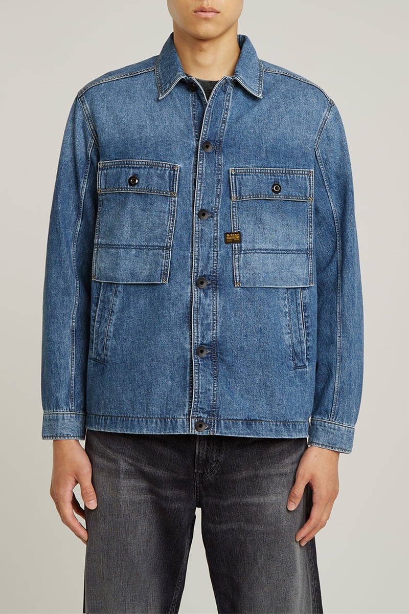A sobrecamisa Mosa em ganga apresenta um corte direito e um fecho com botões de haste. Os bolsos com aba 3D no peito sobrepõem-se aos bolsos com debrum na cintura.