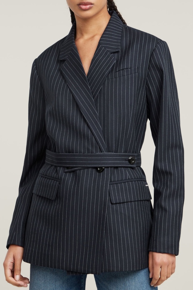 Este casaco Adjustable Pinstripe é totalmente forrado e apresenta um fecho com um único botão. A fivela na cintura permite apertá-la. Este blazer tem um bolso debruado no peito e bolsos com aba na cintura. Foi criada uma abertura na parte de trás.