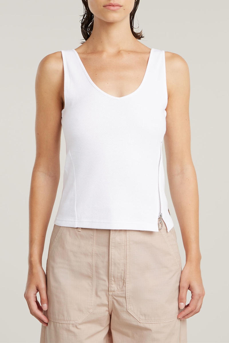 A camisola de alças Asymmetrical Zip Slim oferece um corte ajustado com um profundo decote em V arredondado na frente e nas costas. Uma das costuras diagonais é terminada por um fecho de correr.
