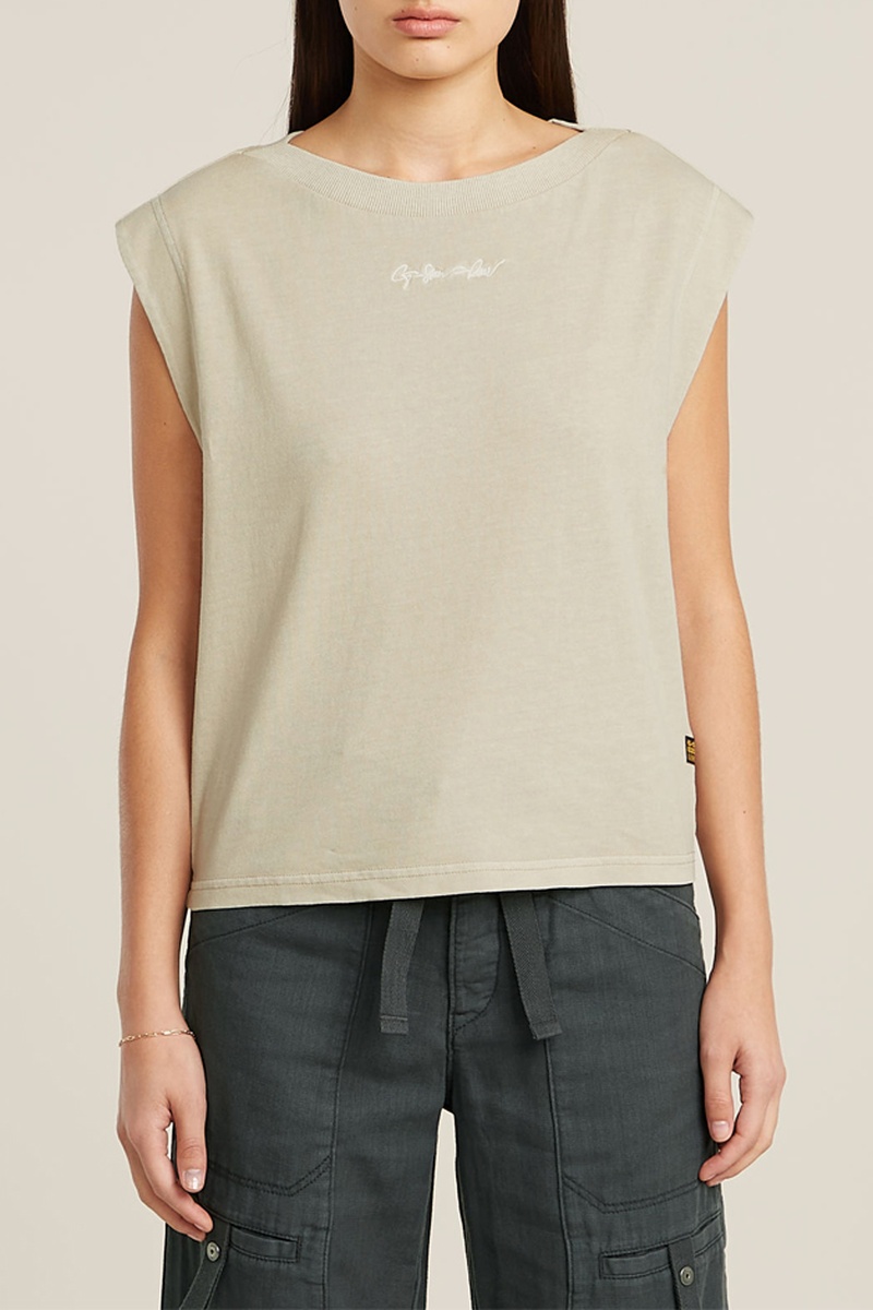 O top Mini G-Script Logo Overdyed apresenta um corte direito e ombros alargados. As cavas são profundas e são parcialmente cobertas por uma sanfona.