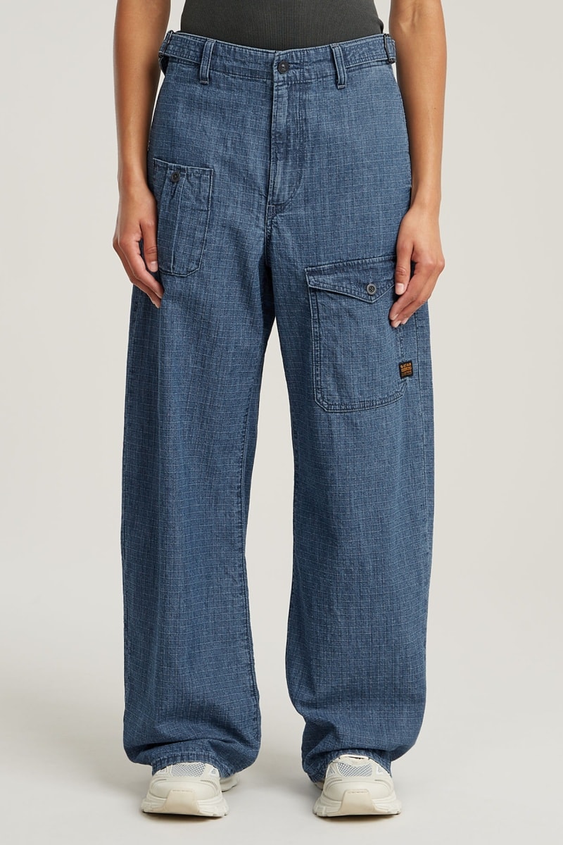 As calças de ganga Belted Cargo apresenta um corte amplo. Aperte as tiras à cintura para ajustá-las. As calças de ganga apresentam bolsos com botões emblemáticos na frente. Os bolsos embutidos na costura lateral e os bolsos traseiros completam este modelo.