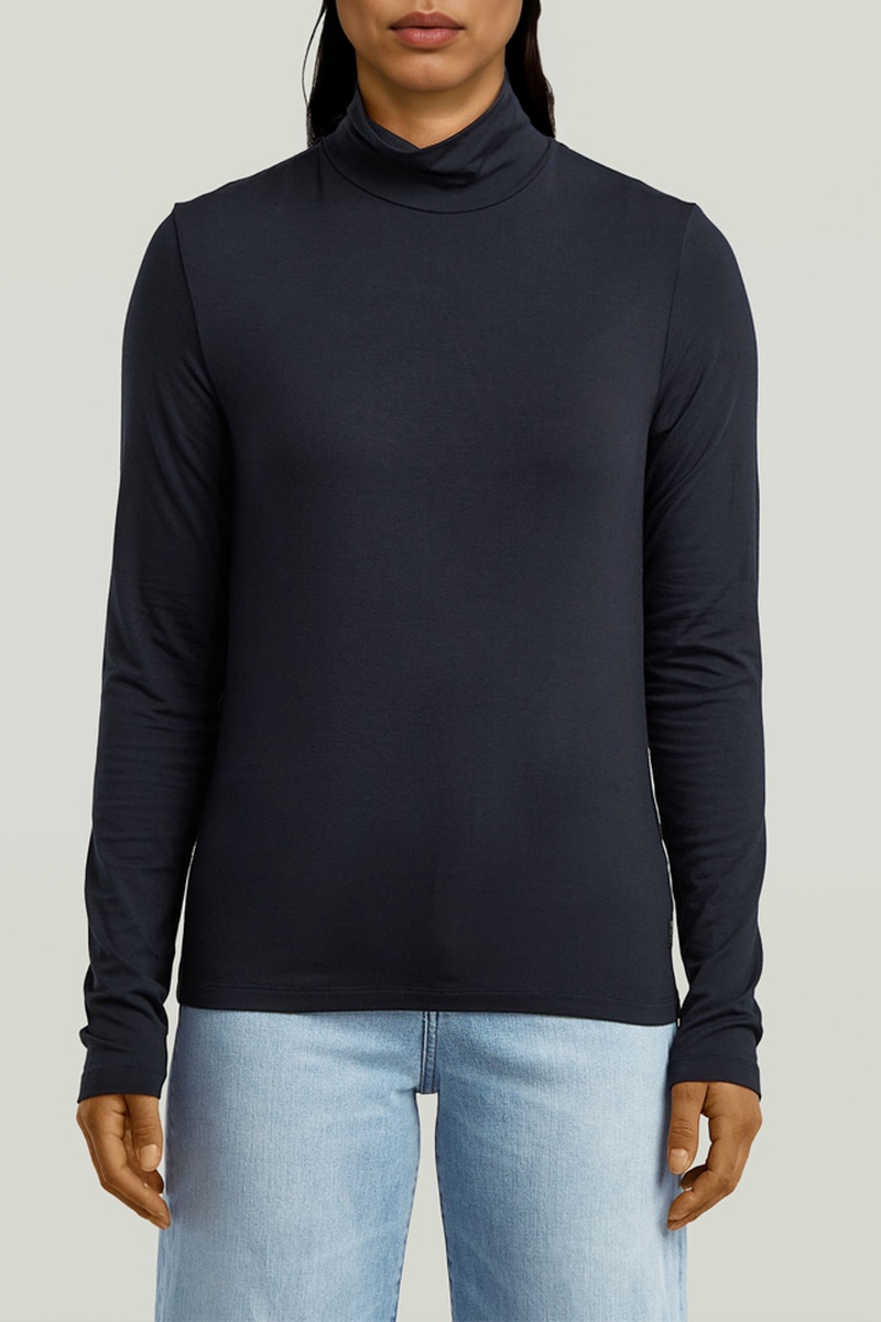 A t-shirt Mock tem gola redonda e mangas compridas.