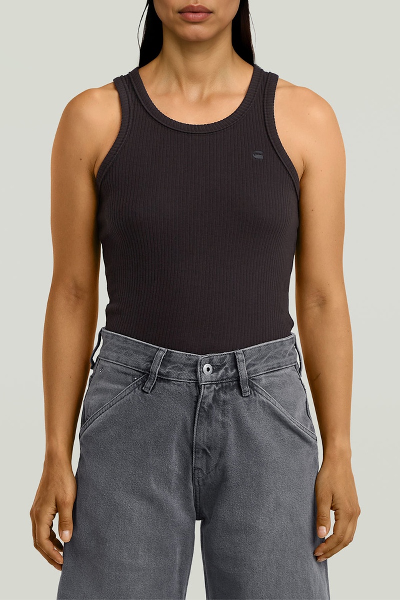 A camisola Ribbed apresenta um design sem mangas com alças largas e uma gola redonda.