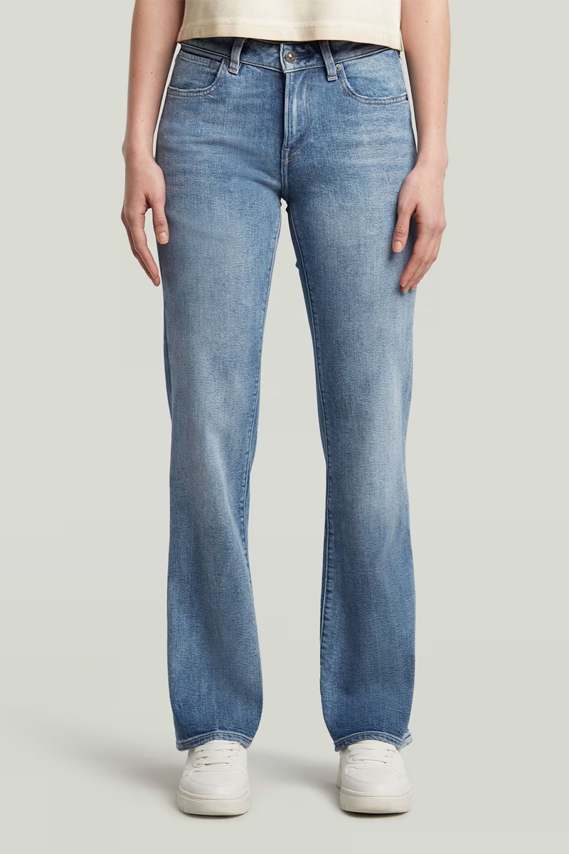 Corte justo e evasê na parte inferior da perna. 5 bolsos e uma braguilha com fecho zip.