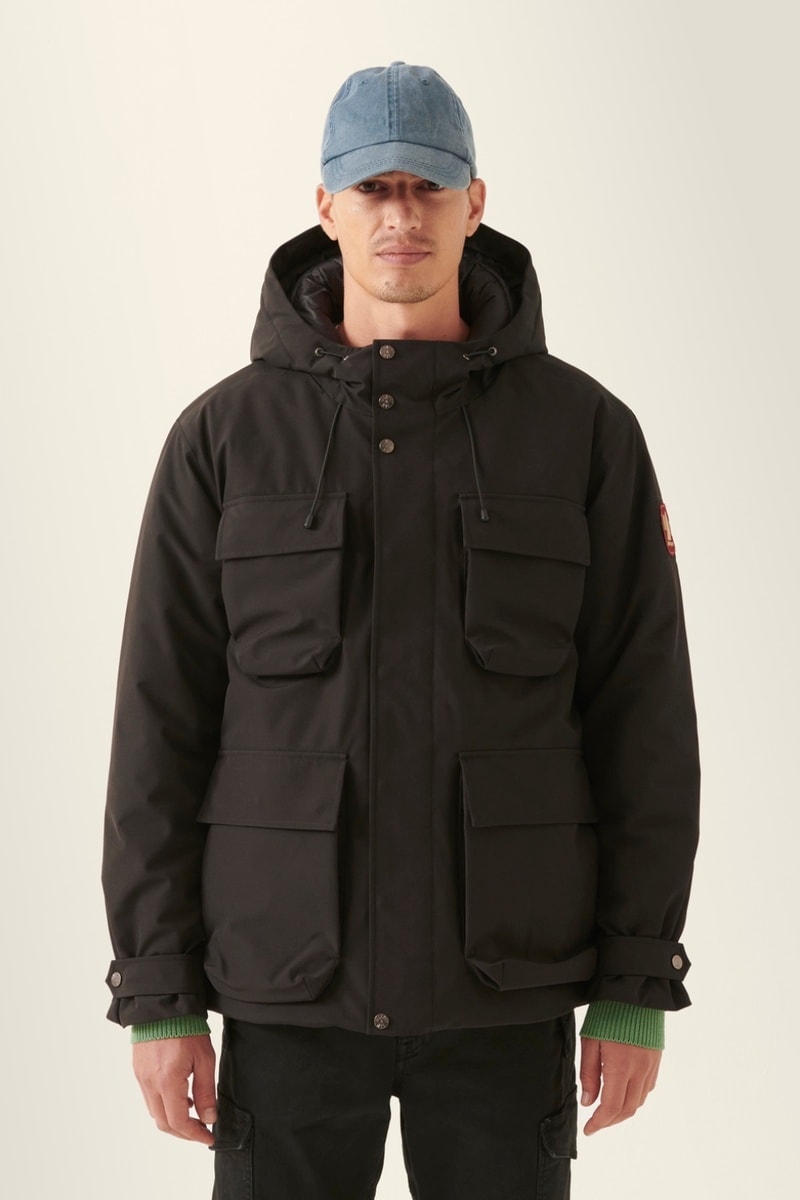 Mangas compridas com lingueta regulável pressionável 1 das quais com remendo e logótipo.