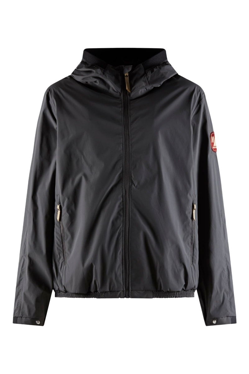 Mangas compridas elásticas 1 das quais com remendo e logótipo.