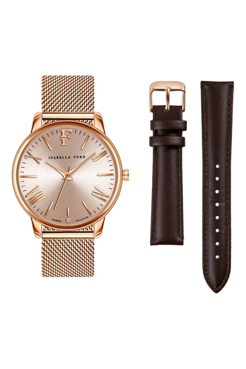 2 braceletes relógio permutáveis: 1 em malha milanesa e 1 com efeito de couro.