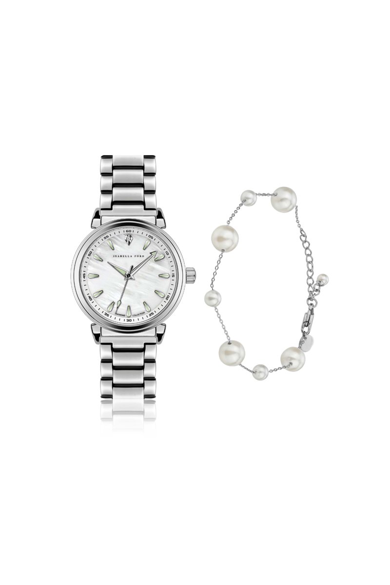 Coffret relógio de quartzo banhado a ião prata, diamante e madrepérola e pulseira Joie