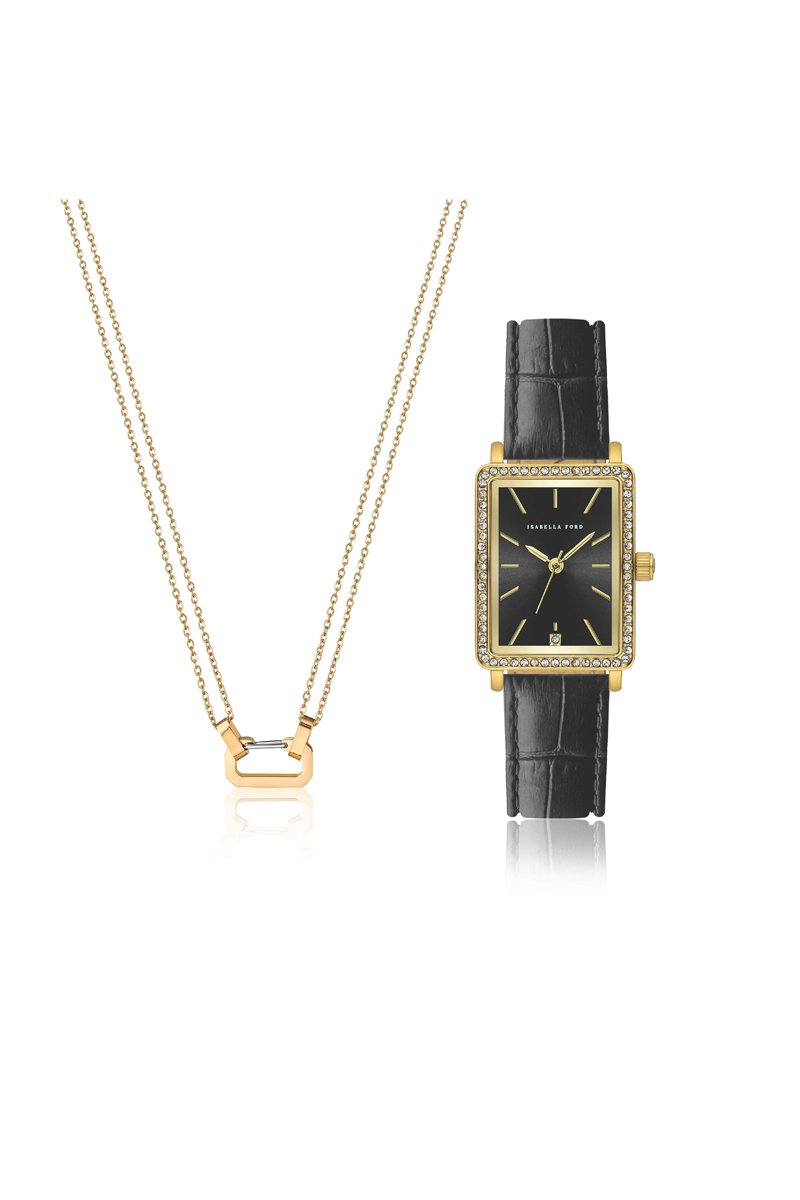 Coffret relógio de quartzo em couro, banhado a ião ouro amarelo e diamantes e colar Adélaïde