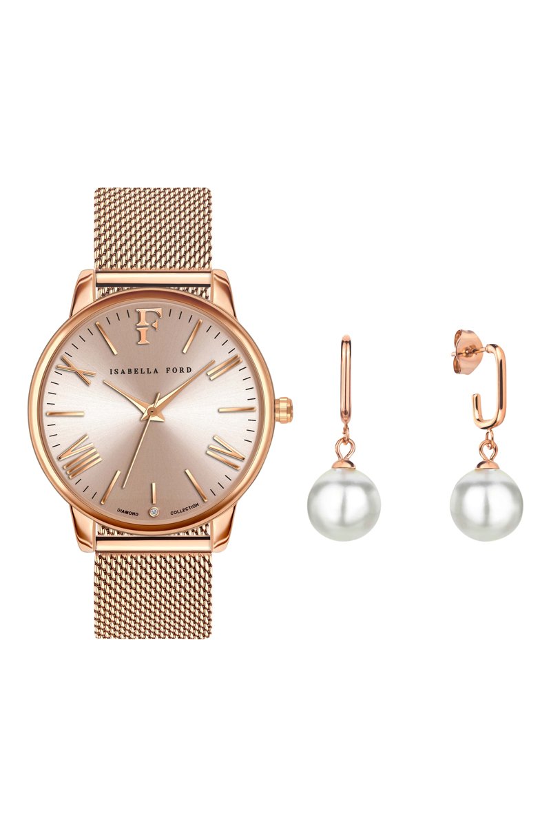 Coffret relógio de quartzo em aço, diamante e brincos e pérolas finas Scarelett