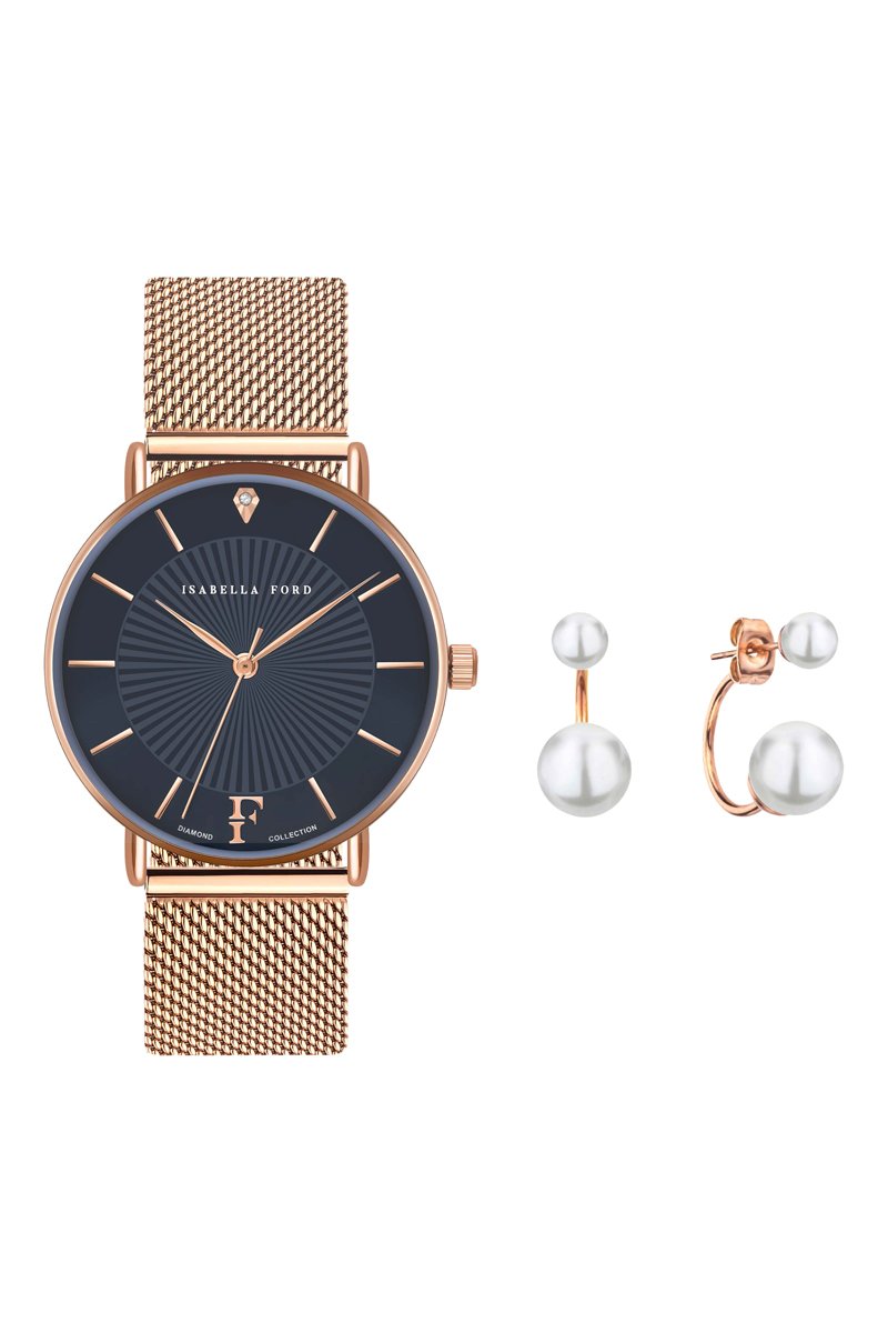 Coffret relógio de quartzo em aço, diamantes e brincos e pérolas finas Florence