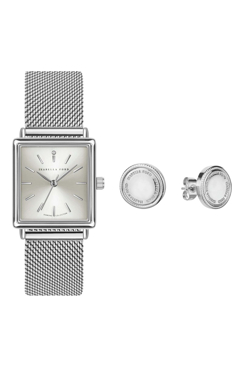Coffret relógio de quartzo em aço e diamante e brincos Morgane