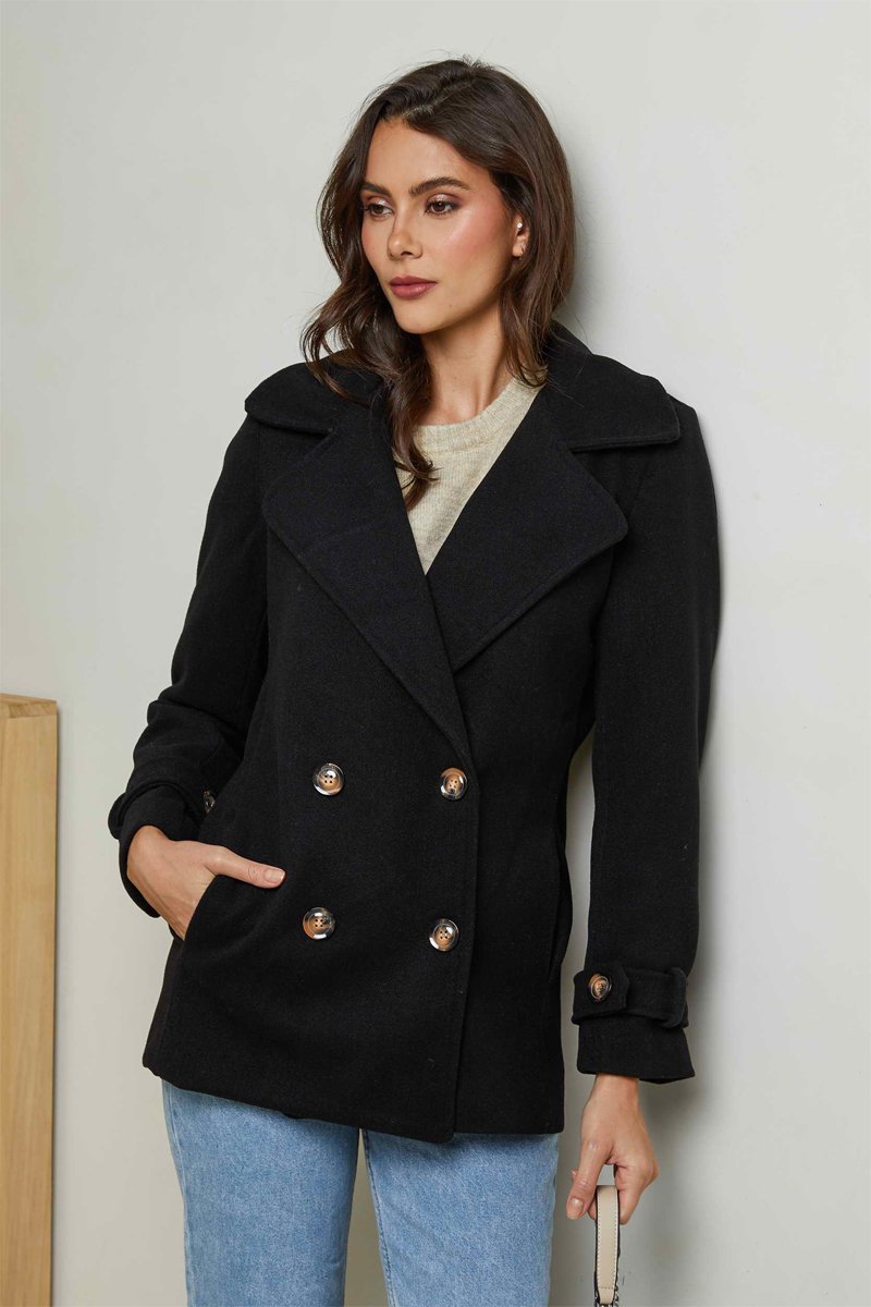 Casaco de pele comprido com tira abotoável sob presilhas.
