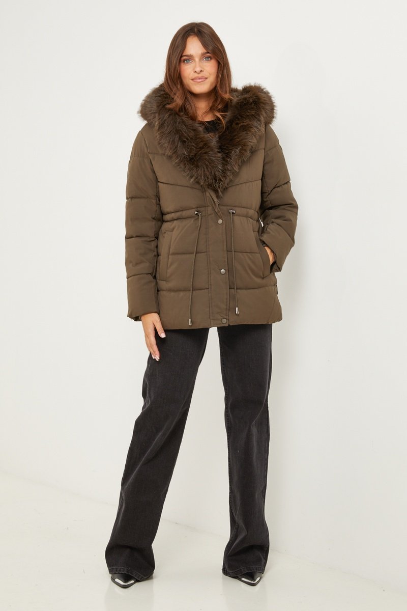 Blusão com capuz sintético com pelo amovível de mangas compridas.