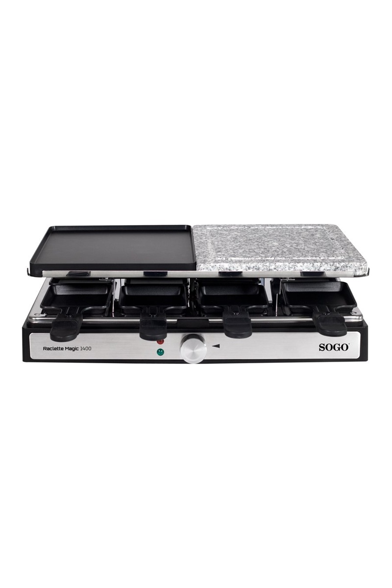 Aparelho para raclette e grelhador para 8 pessoas em aço inoxidável.