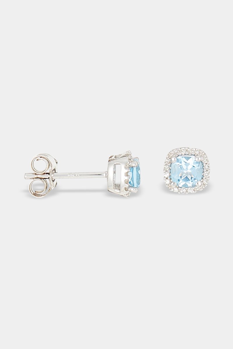 Brincos de ouro branco com 16 diamantes e um topázio.