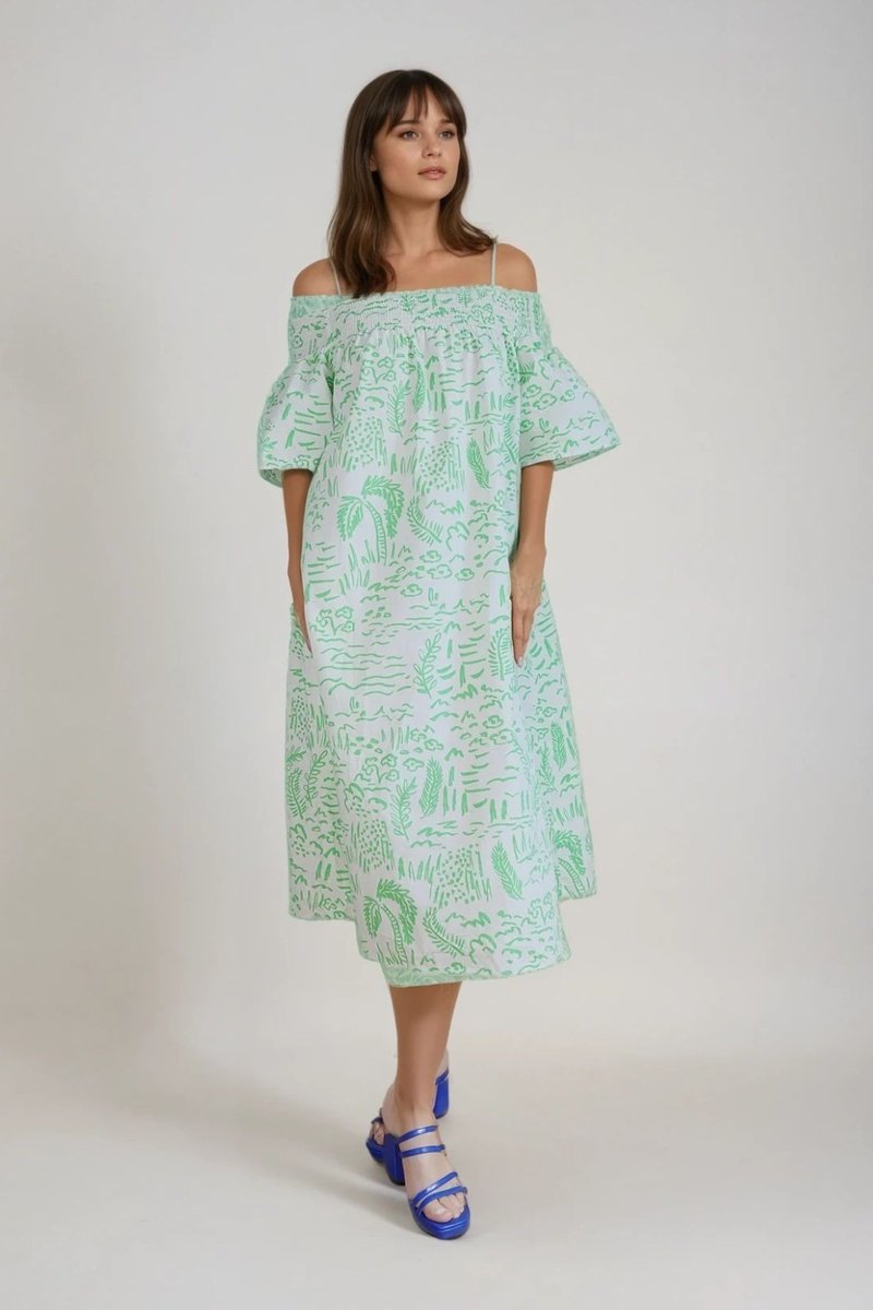 Vestido midi de mangas curtas volumosas.