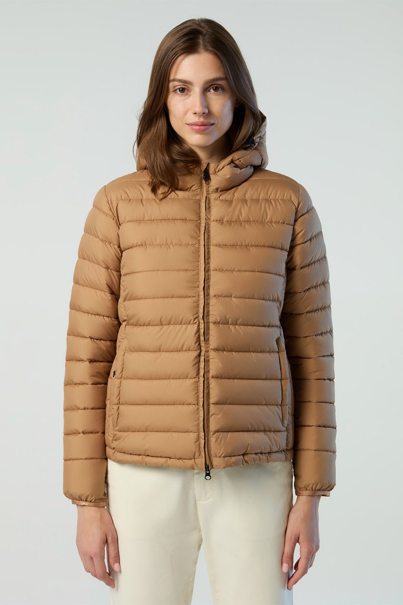 Blusão com capuz com atilhos de ajuste e travões de cordão.
