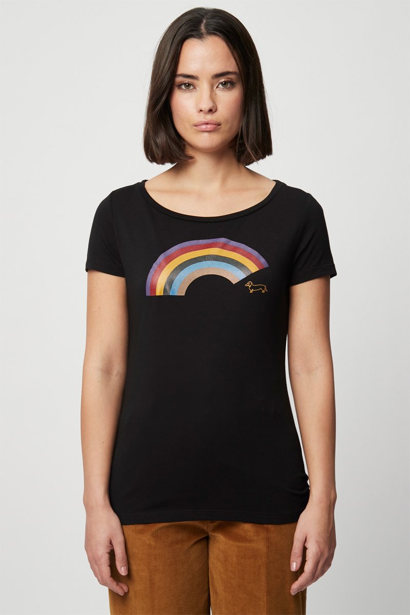 Padrão arco-íris e logótipo à frente.