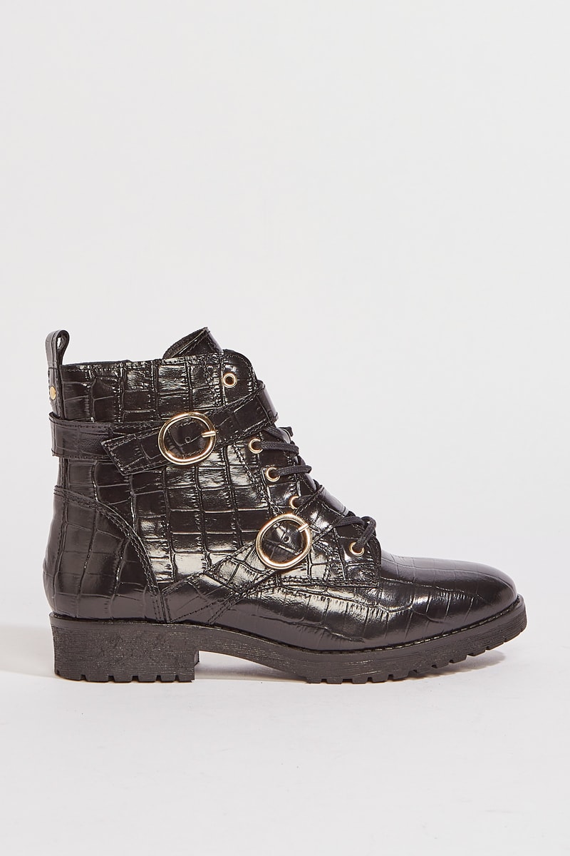 Fecho com atacadores, tiras de fivela à frente e com zip de lado.