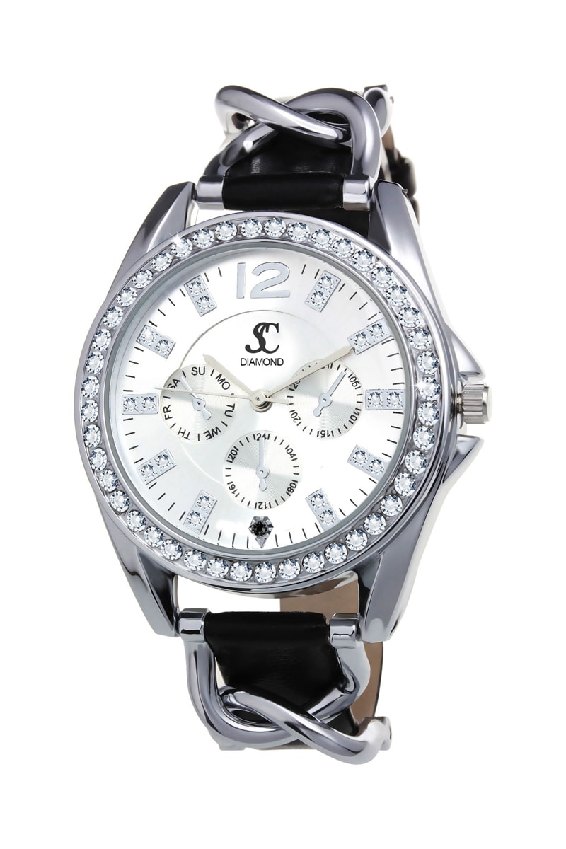 Relógio de quartzo em sintético e diamante - Preto e prateado