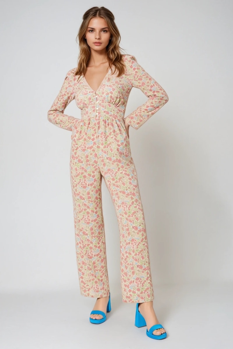 Macacão de mangas compridas volumosas.