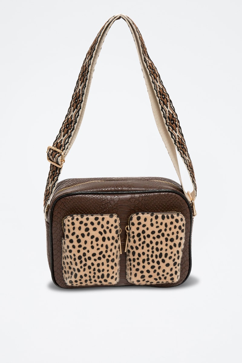 2 bolsos com fecho zip efeito de couro de potro e estampado leopardo à frente.