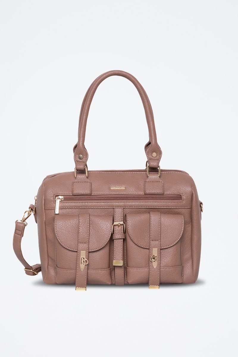 Bolso exterior com zip, 2 compartimentos exterior com aba e tiras, tira com fivela e placa metálica com logótipo à frente.