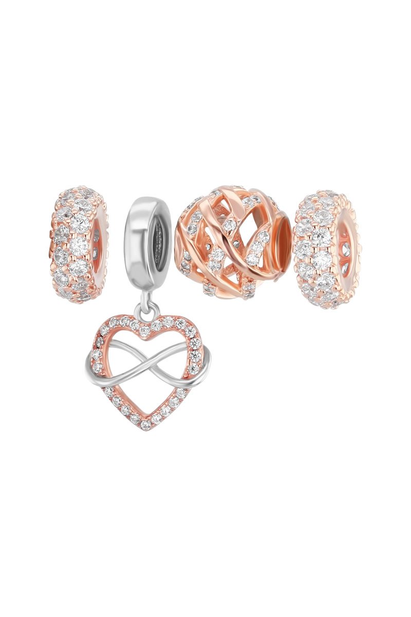 3 contas de prata banhada a ouro rosa com zircónios e 1 conta pendente em prata banhada a ouro rosa com zircónios.