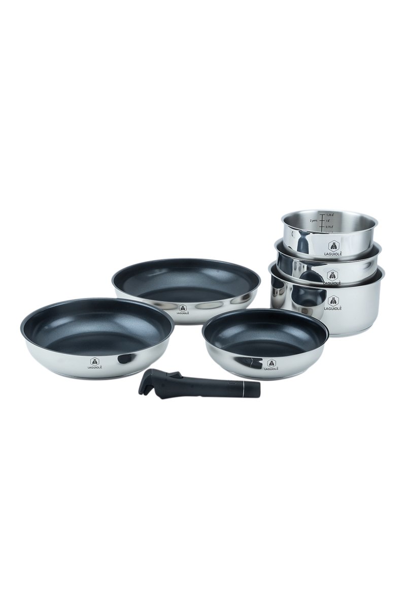 3 panelas e 3 frigideiras de aço inoxidável 202 e revestimento anti-aderente Greblon® CK2 e 1 pega amovível - 16/18/20 cm e 20/24/28 cm - 1,25/2/2,5 l e 1,25/1,8/2,5 l