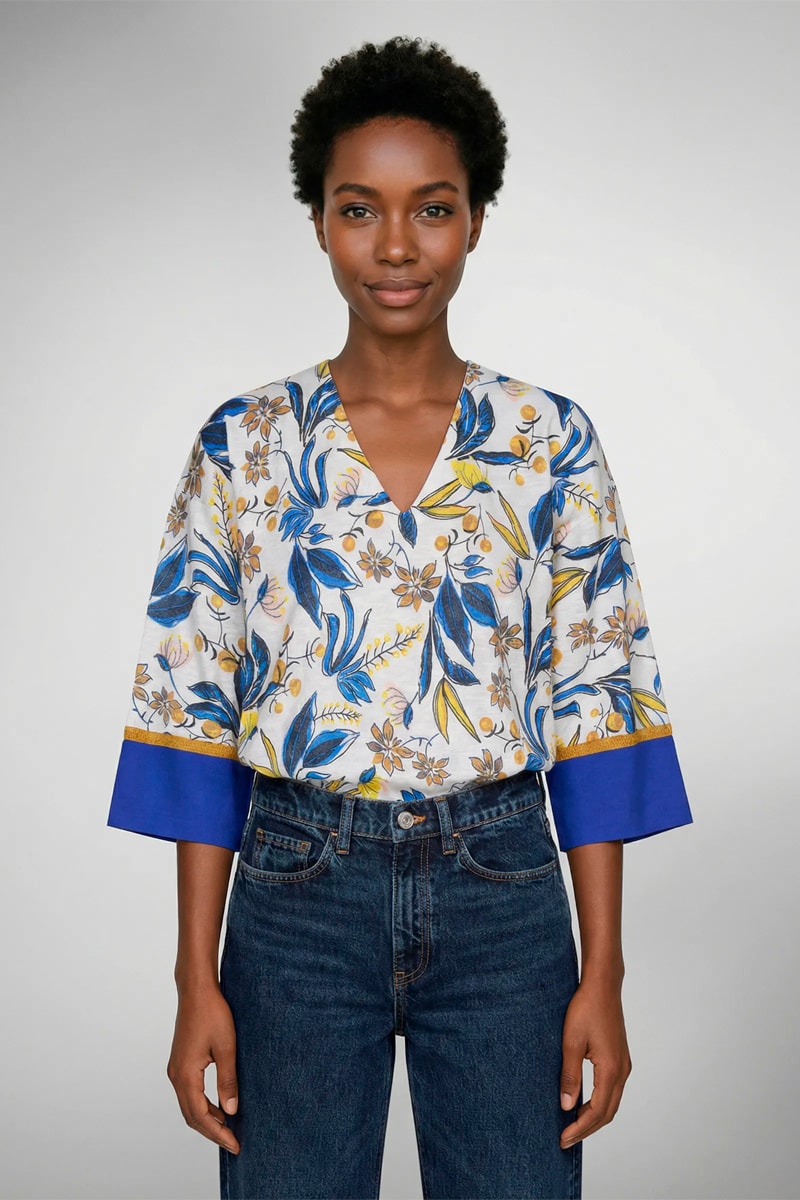 Cor: azul-cobalto, amarelo, cru e bege