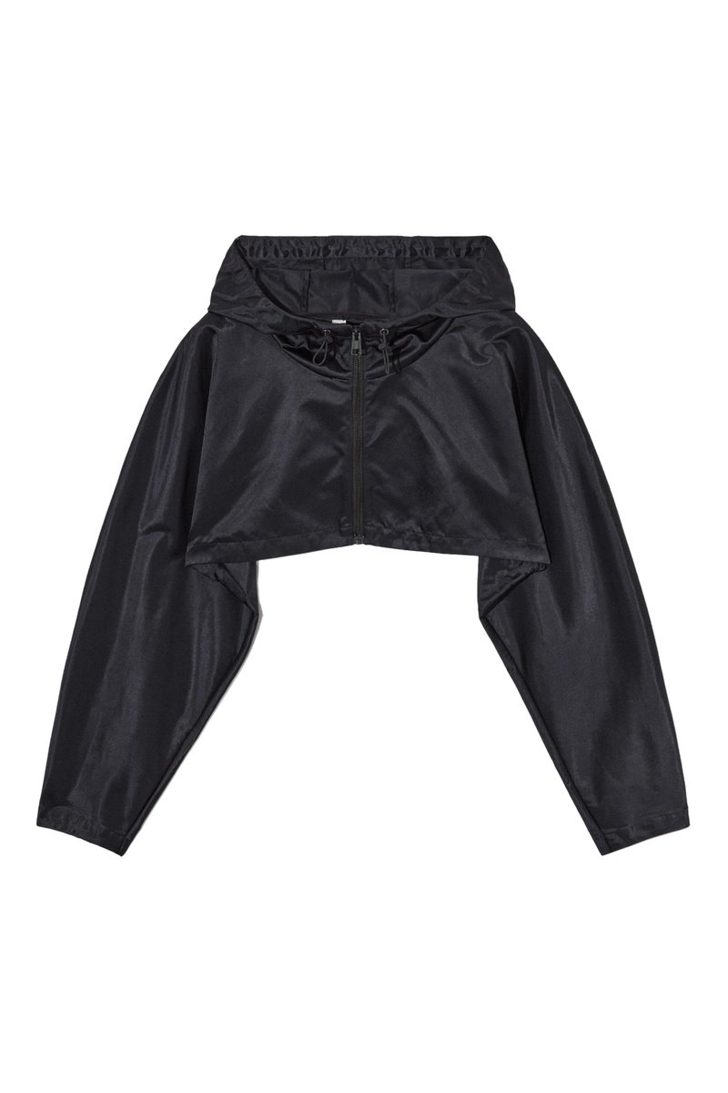 Casaco com capuz e atilhos de ajuste.