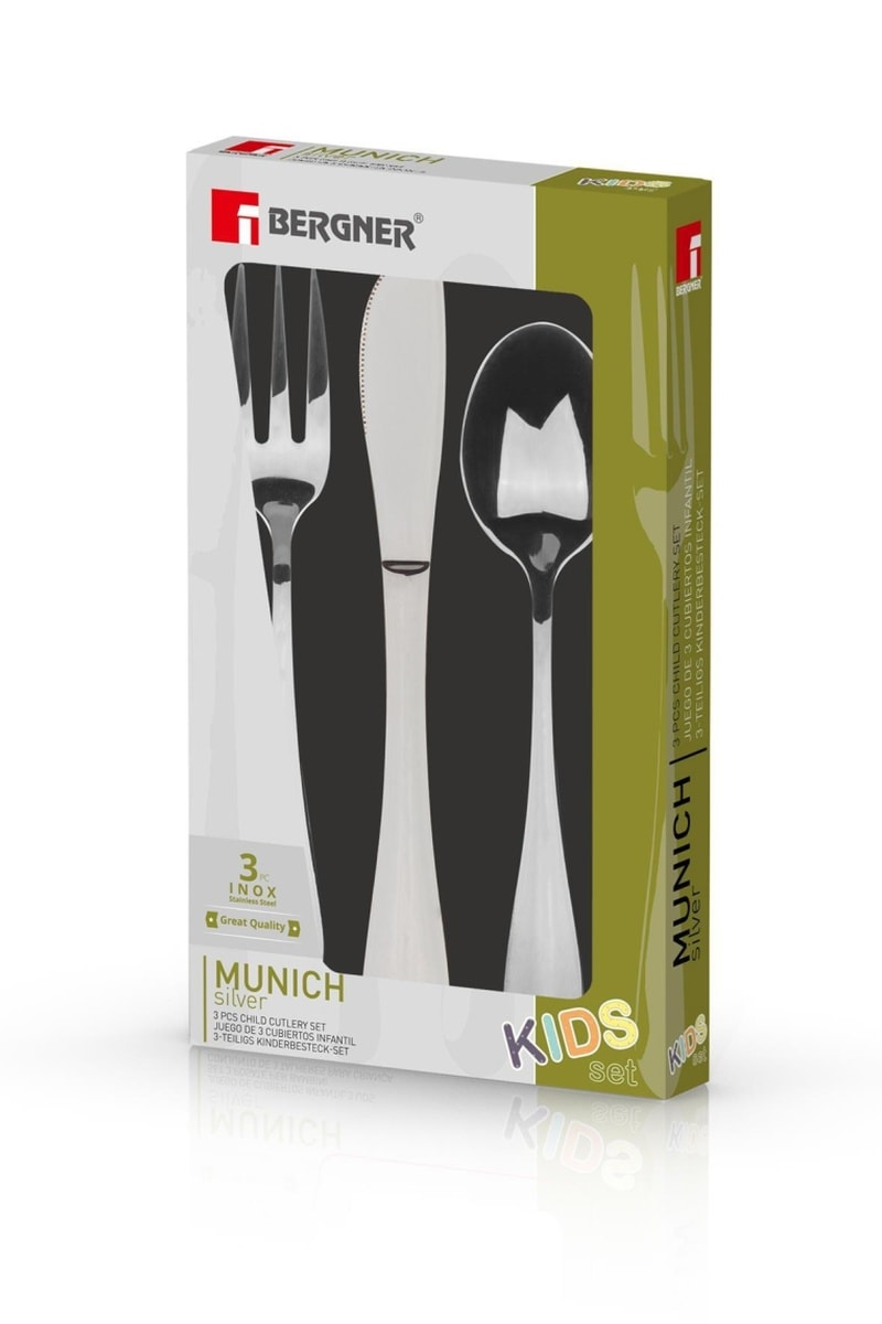 Talheres para criança em aço inoxidável incluindo uma faca, um garfo e uma colher.