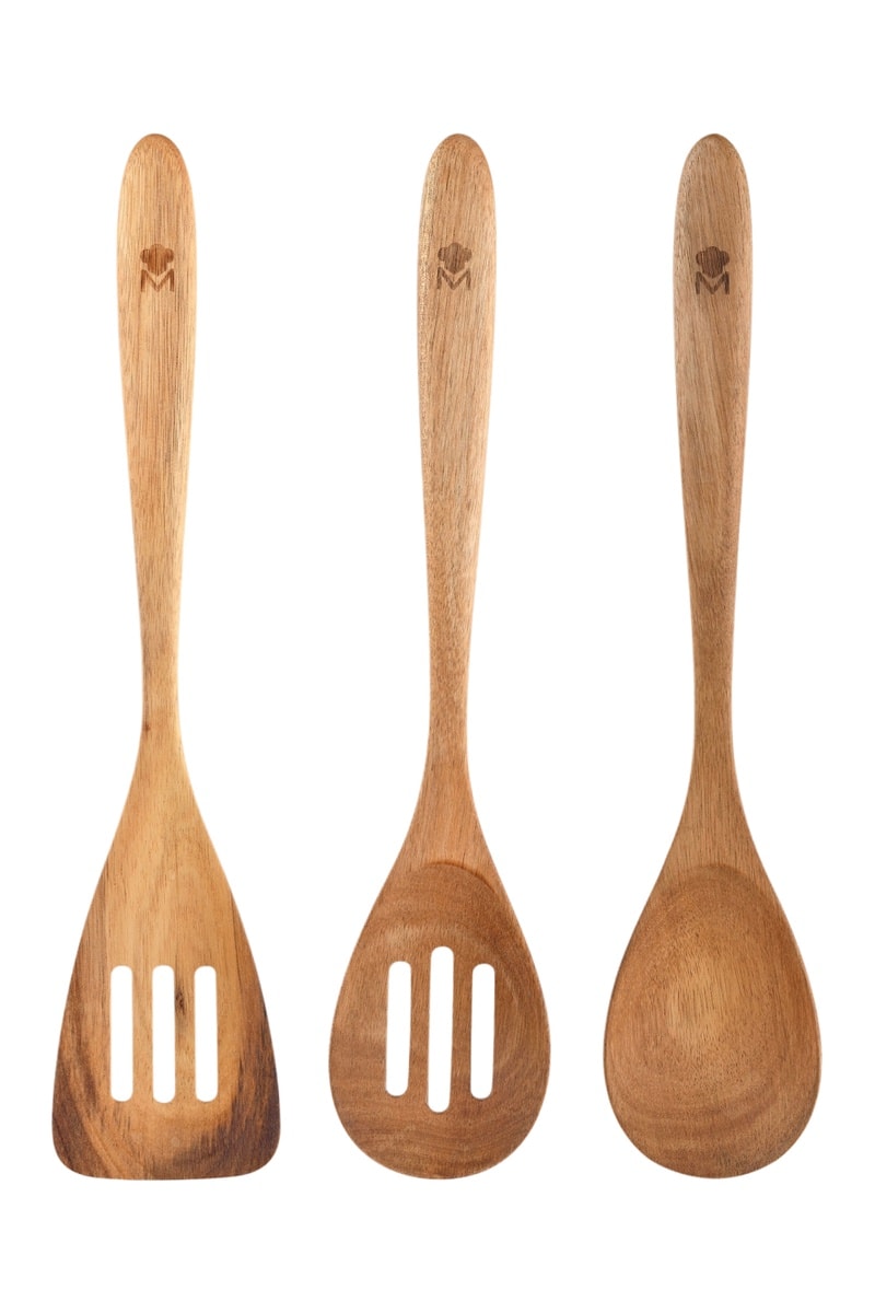 3 utensílios em madeira de acácia: