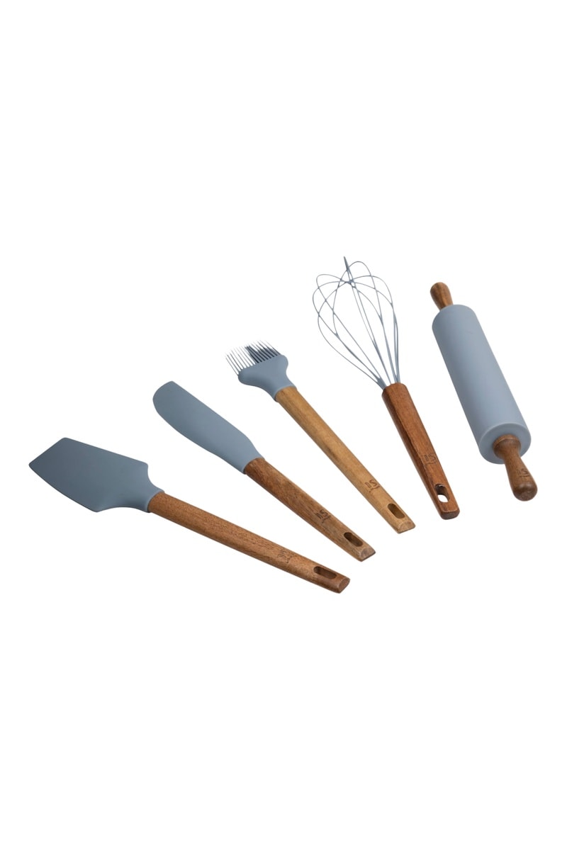 5 utensílios em silicone e acácia: