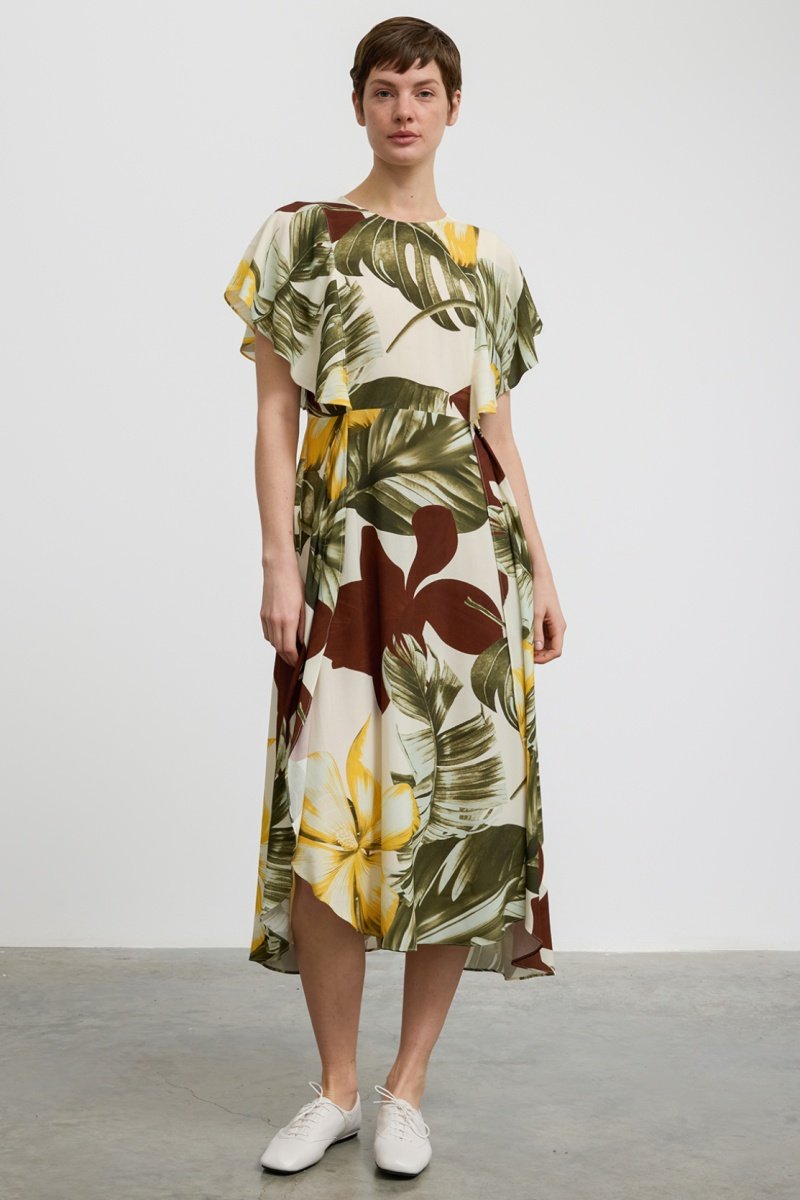 Vestido midi de mangas curtas com folhos.