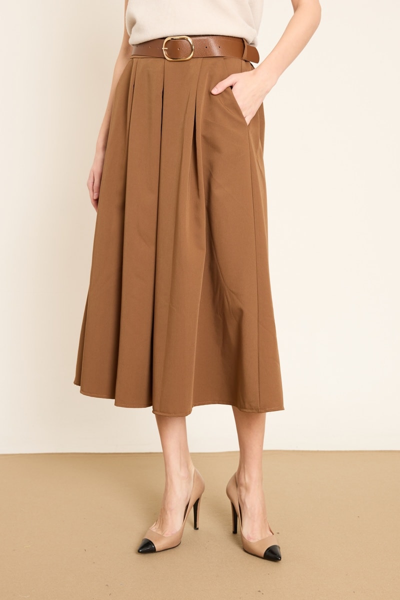 Saia midi plissada cintura subida - Castanho