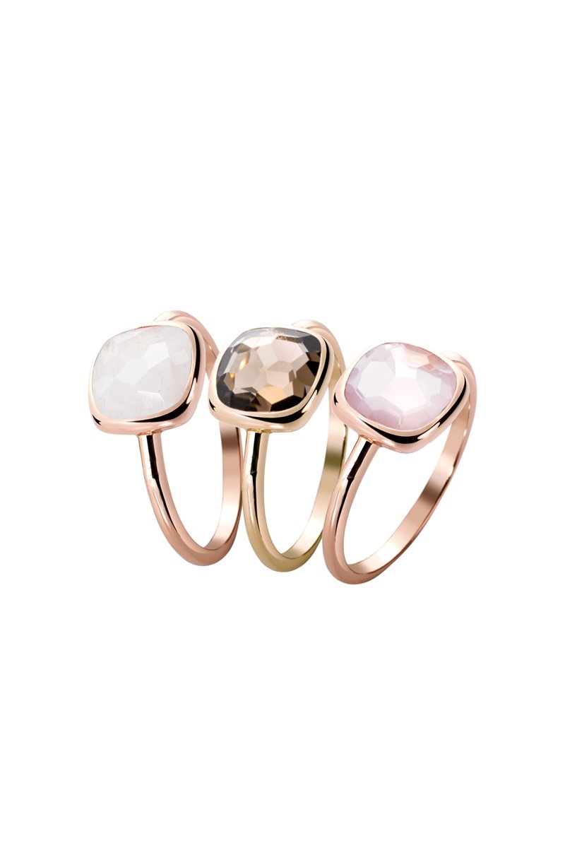 3 anéis - Prata banhada a ouro amarelo, prata banhada a ouro rosa, quartzo fumado, quartzo rosa e pedra de lua