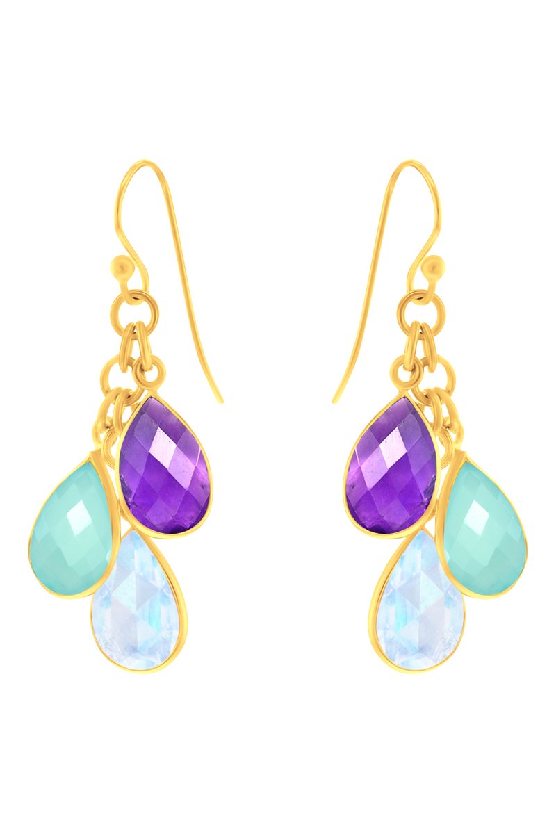 Brincos em prata banhada a ouro amarelo com uma calcedónia, um rainbow moonstone e uma ametista.