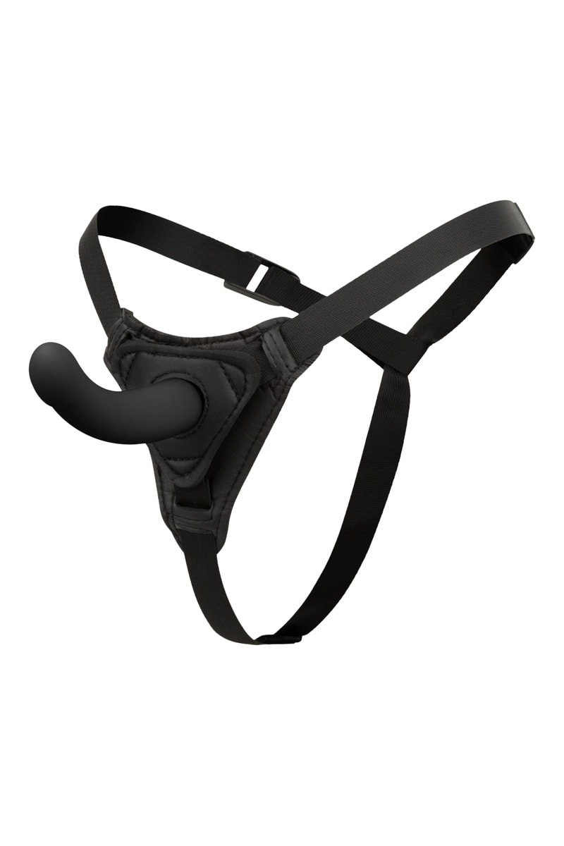 O conjunto inclui um arnês ajustável e um dildo de silicone.
