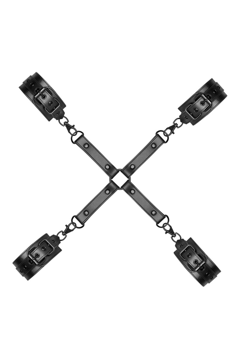 O conjunto inclui algemas para as mãos, algemas para tornozelos e uma amarração hogtie que pode ser utilizada de diferentes maneiras.