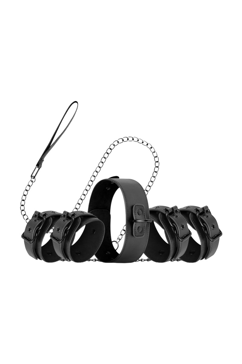 O conjunto inclui um colar com trela, algemas e algemas para tornozelos.