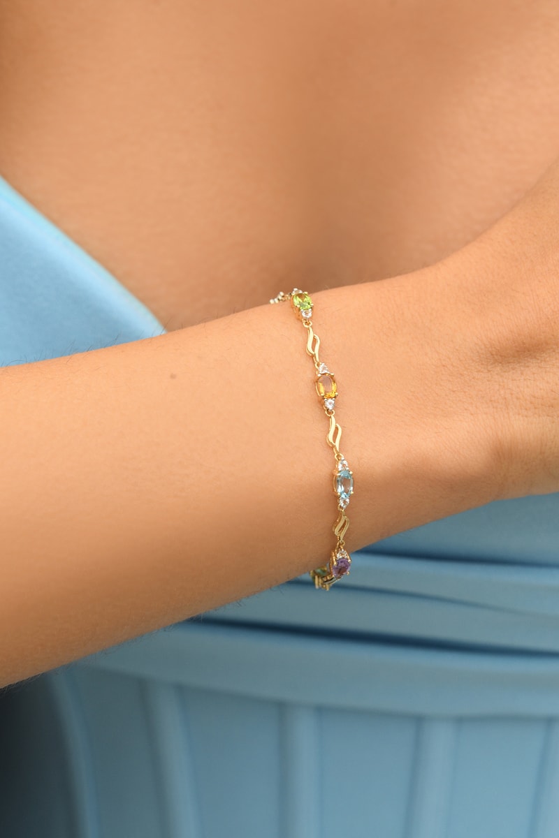 Pulseira de ouro amarelo com 14 topázios brancos, com 2 topázios azuis, com 2 ametistas, com 2 peridotos e uma citrina.