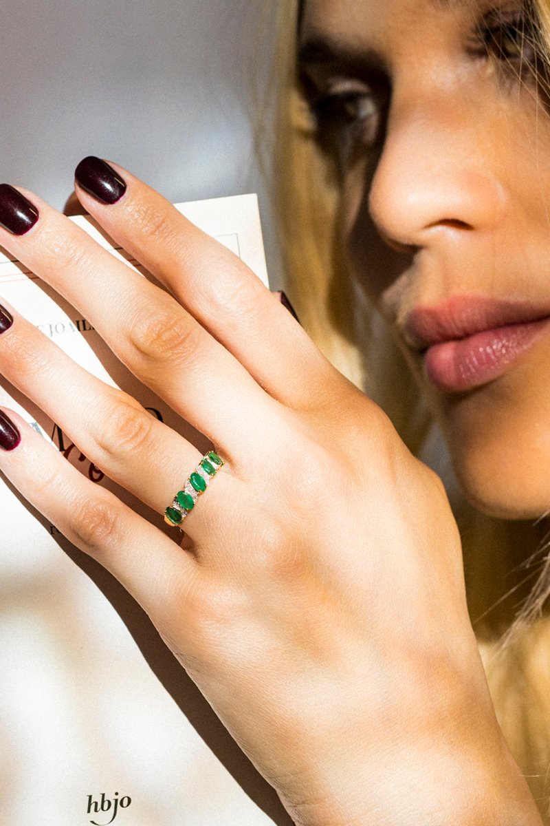Anel em ouro amarelo com 30 diamantes e 5 esmeraldas.