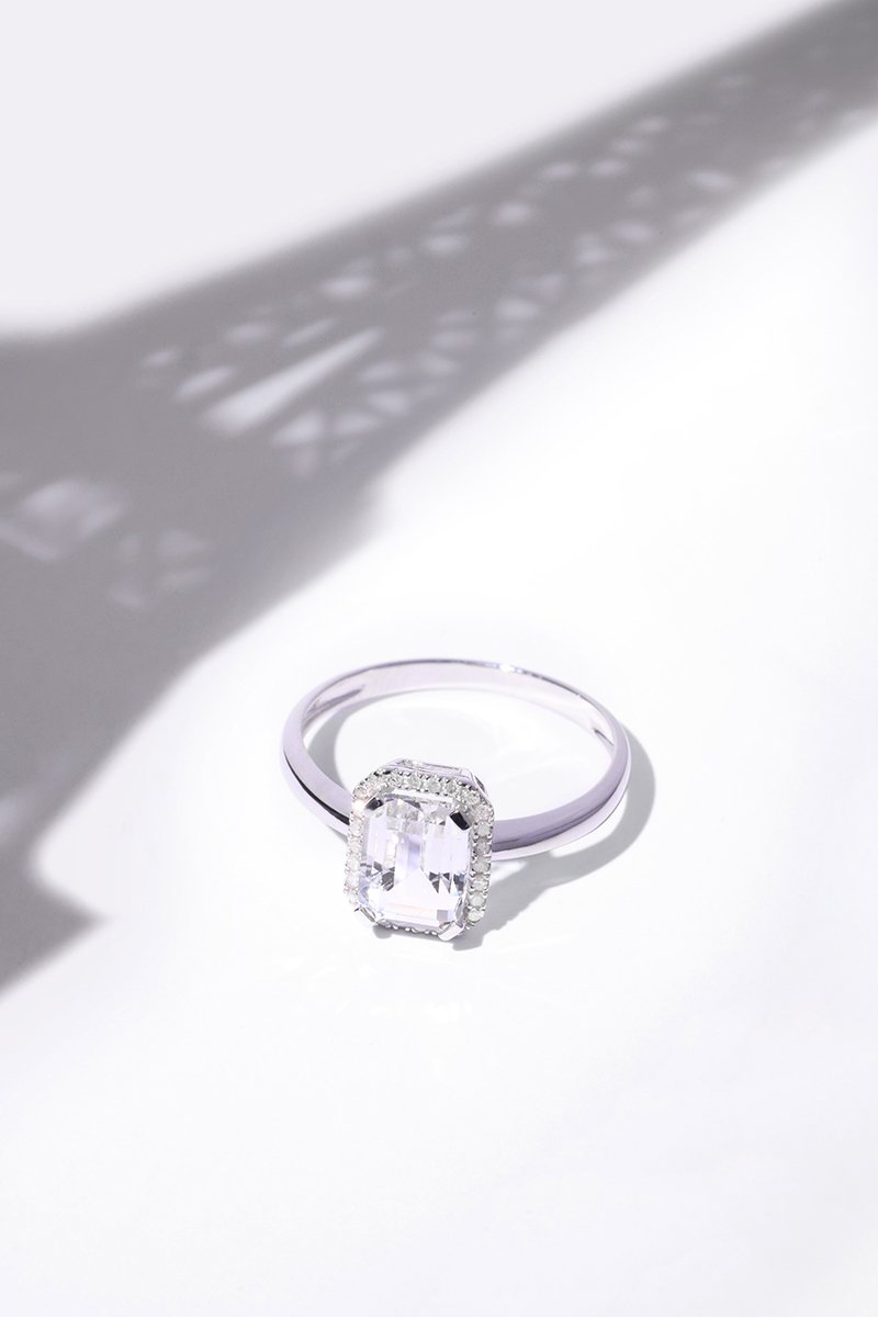Anel de ouro branco com um topázio e 26 diamantes.