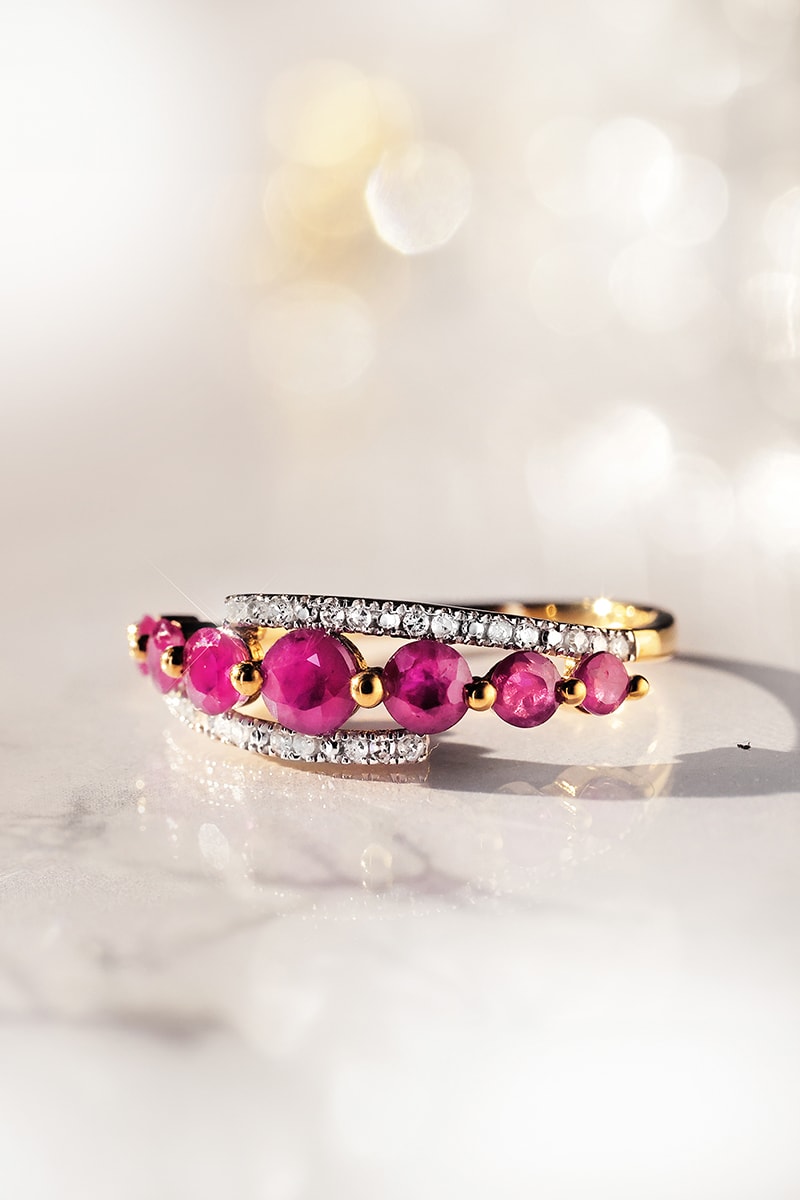 Anel de ouro amarelo com 7 rubis e 24 diamantes.