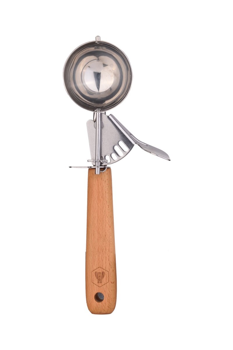 Colher para gelados em aço inoxidável. Cabo ergonómico em faia.