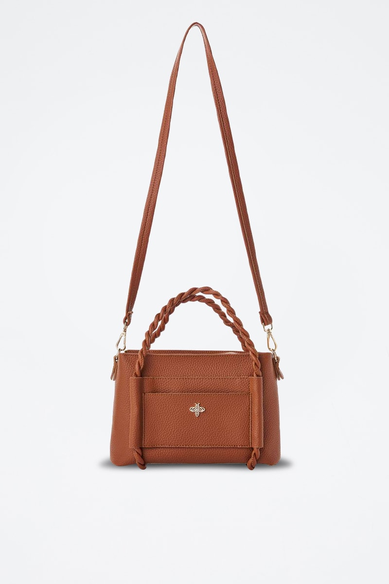 Bolso e logótipo metálico à frente.