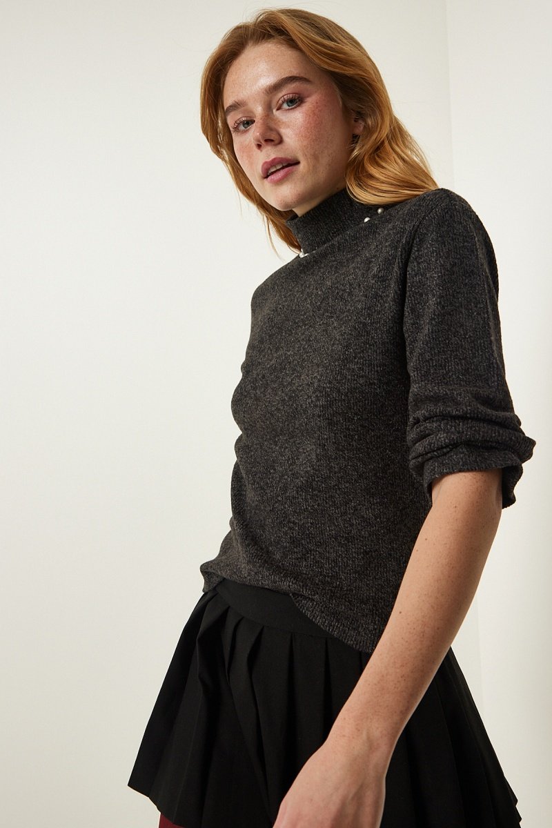 Gola subida com pérolas decorativas.